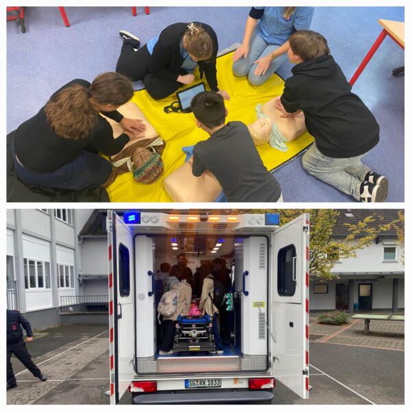 Damit dies auch gut gelingt, wurden bereits unsere Schülerinnen und Schüler der Jahrgangsstufe 6 am 25.09.2025 geschult. Theorie kombiniert mit praxisnahen Übungen sowie individuelle Betreuung erhöhte das Verständnis und den Mut zum Mitmachen. Besonders interessant waren zudem auch die Erklärungen zum Rettungswagen. Wir danken dem DRK für die wunderbare Gestaltung des Tages! Es hat allen viel Freude bereitet.